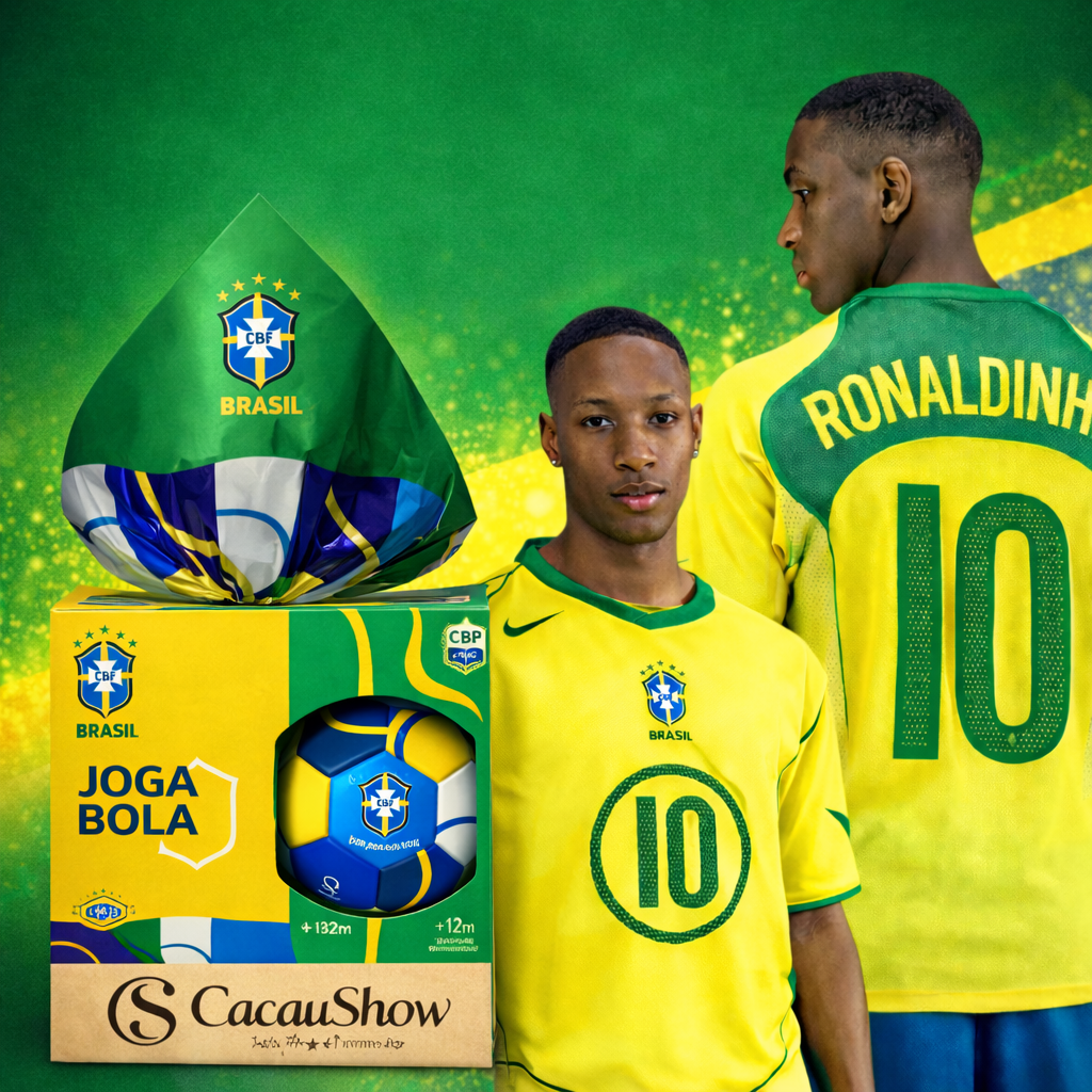 Nesta Páscoa, não é apenas chocolate. É o manto sagrado, é a reedição da lendária **Total 90 do Ronaldinho**, é o orgulho de ser brasileiro em cada mordida.